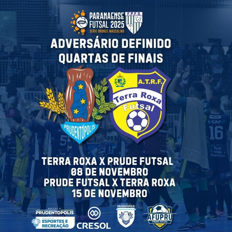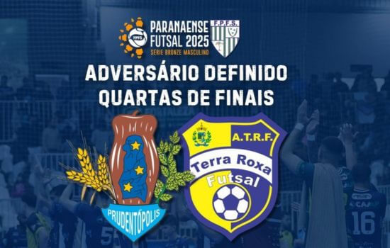 A equipe de Prudentópolis carimbou vaga nas quartas de final do Paranaense de Futsal – Série Bronze 2025 e terá pela frente o Terra Roxa Futsal. O confronto será em dois jogos: a ida no dia 8 de novembro, em Terra Roxa, e a volta, valendo a classificação, no dia 15 de novembro, às 20h30, no Ginásio Gilmar Agibert.