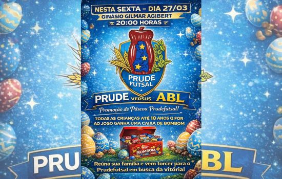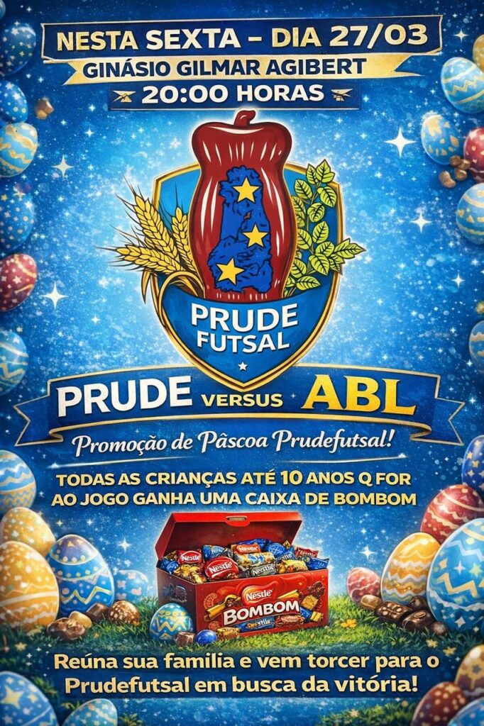 O Prude Futsal entra em quadra nesta sexta-feira (27), às 20 horas, no Ginásio Gilmar Agibert, em Prudentópolis, para enfrentar a equipe da ABL em mais um compromisso pela temporada. Além da expectativa pelo confronto dentro de quadra, o clube preparou uma ação especial de Páscoa para envolver ainda mais a comunidade e incentivar a presença das famílias no ginásio. Todas as crianças de até 10 anos que comparecerem ao jogo receberão uma caixa de bombom, em uma iniciativa que busca transformar a partida em um momento de lazer e celebração. A proposta reforça a conexão entre o time e a torcida, criando um ambiente festivo e acolhedor, especialmente para o público infantil. Dentro de quadra, a equipe prudentopolitana busca a vitória diante de seus torcedores, contando com o apoio vindo das arquibancadas para somar pontos importantes e seguir firme na competição.