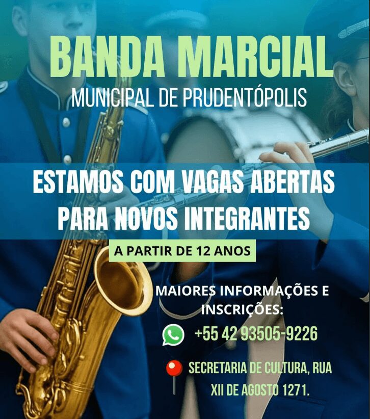 A Secretaria de Cultura de Prudentópolis está formando a Banda Marcial Municipal e confirma que as inscrições já estão abertas para novos integrantes com idade a partir de 12 anos. Os encontros ocorrerão às segundas-feiras, na Casa da Cultura, com turmas nos horários 13h, 16h, 18h e 20h.