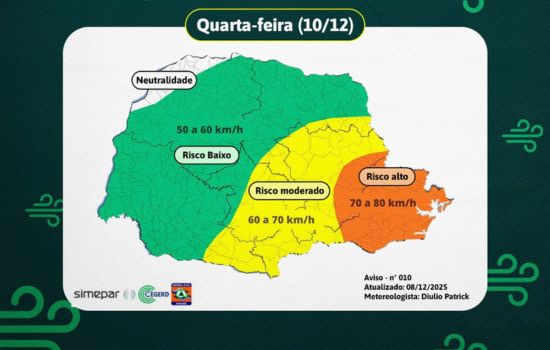 De acordo com os serviços de meteorologia, o sistema mantém ventos constantes e rajadas mais fortes em várias regiões do Paraná, inclusive nos Campos Gerais. Em outras áreas do Estado já foram registradas velocidades superiores a 70 km/h, e em pontos de maior altitude os valores ultrapassaram os 100 km/h. Para Prudentópolis, o cenário exigirá atenção redobrada durante o período de maior instabilidade, especialmente em locais mais expostos, como áreas abertas, proximidades de árvores, estruturas metálicas e redes de energia.