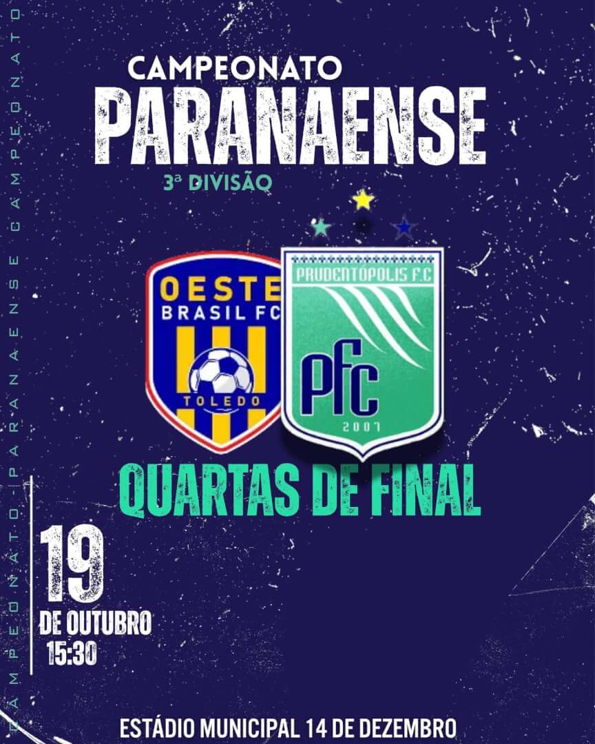 O Prudentópolis FC terá o Oeste Brasil como adversário nas quartas de final do Campeonato Paranaense – 3ª Divisão. O primeiro jogo será fora de casa, no domingo, 19 de outubro, às 15h30, no Estádio 14 de Dezembro, em Toledo. A decisão da vaga ocorre no fim de semana seguinte, no Estádio Municipal Newton Agibert, em Prudentópolis, com data e horário a confirmar pelo clube.