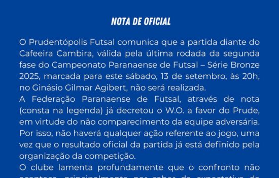 O Prudentópolis Futsal não entrará em quadra neste sábado (13) para a partida contra o Cafeeria Cambira, válida pela última rodada da segunda fase do Campeonato Paranaense de Futsal – Série Bronze 2025. A Federação Paranaense de Futsal confirmou o W.O. em favor do Prude, após a equipe adversária oficializar que não viajaria para Prudentópolis.