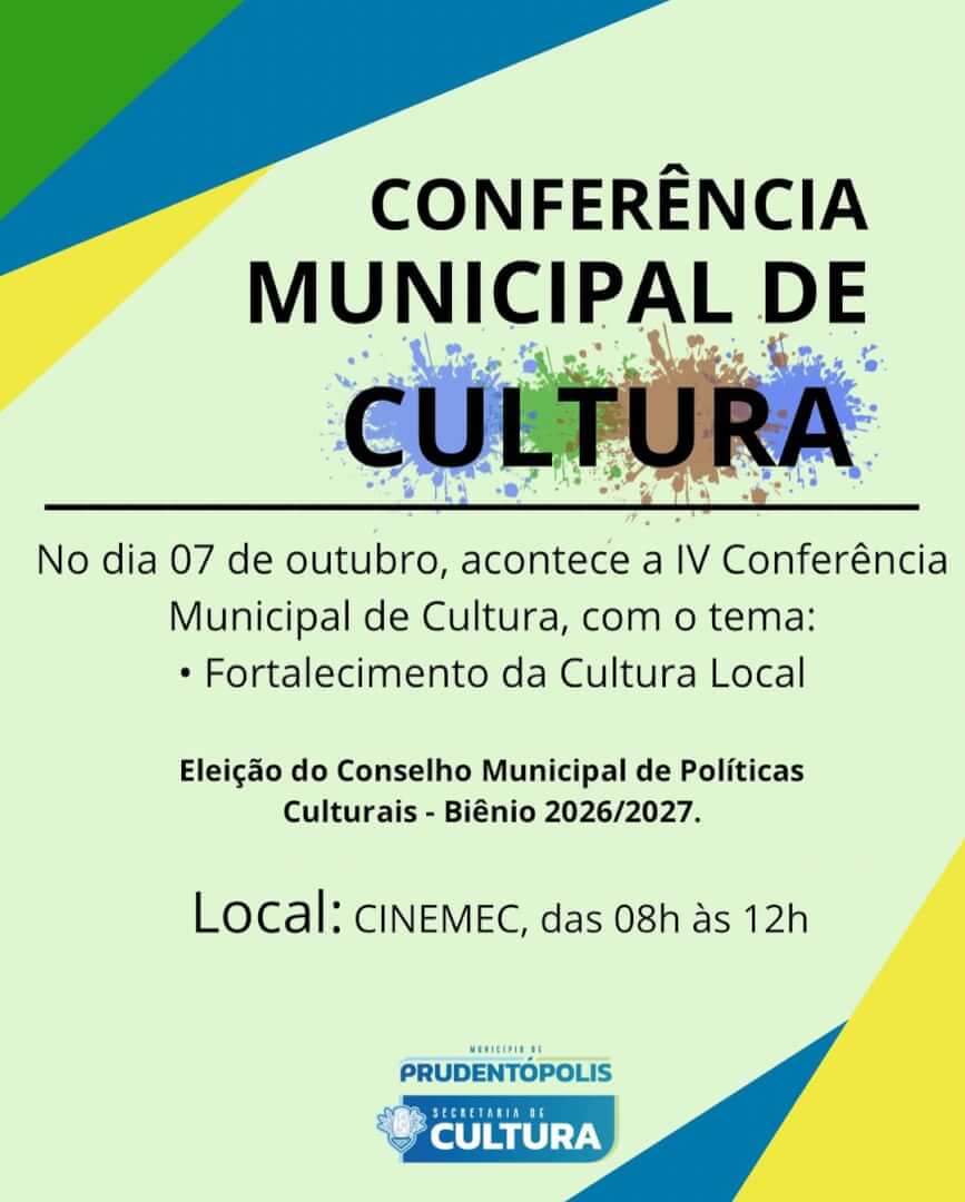 A IV Conferência Municipal de Cultura de Prudentópolis acontece na terça-feira, 7 de outubro, das 8h às 12h, no CINEMEC, com o tema “Fortalecimento da Cultura Local”. Além de discutir propostas para o setor, o evento fará a eleição dos representantes do Conselho Municipal de Políticas Culturais para o biênio 2026/2027.