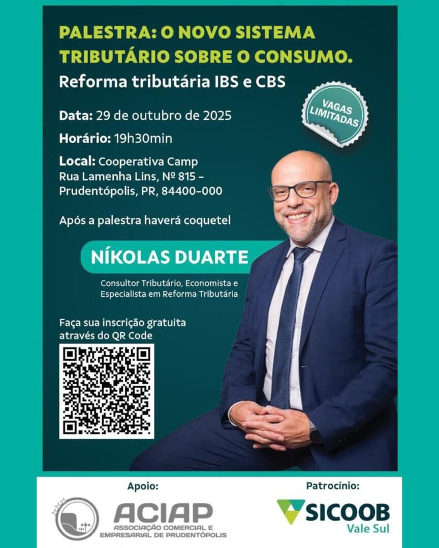 A Associação Comercial e Empresarial de Prudentópolis (ACIAP) promove, no dia 29 de outubro de 2025, uma palestra sobre “O novo sistema tributário sobre o consumo — Reforma tributária IBS e CBS”, com o objetivo de esclarecer as principais mudanças previstas na legislação e seus reflexos diretos para empresários e profissionais da área contábil.