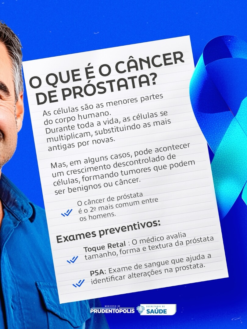 A Secretaria Municipal de Saúde de Prudentópolis aderiu à campanha Novembro Azul e, durante todo o mês, vai reforçar a importância do diagnóstico precoce do câncer de próstata o segundo mais comum entre os homens e de outras doenças que afetam a saúde masculina. A iniciativa, divulgada nas redes oficiais do município, destaca que cuidar da saúde também é papel do homem.