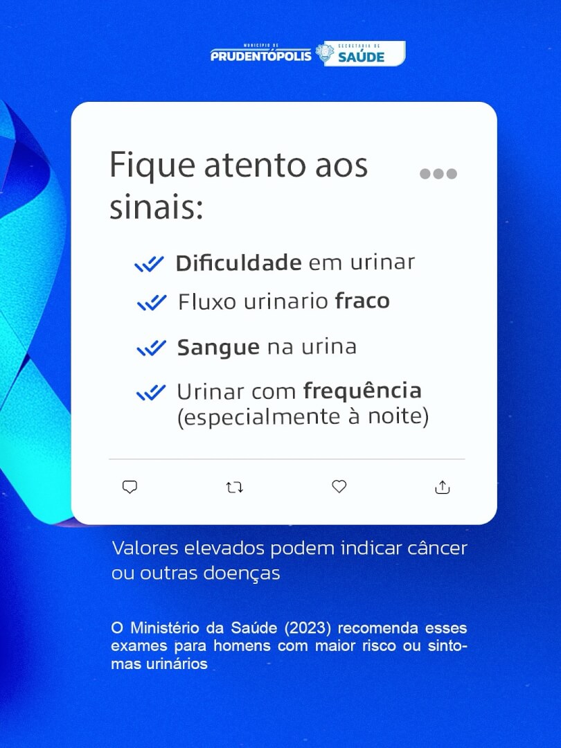 Outro ponto enfatizado são os sinais de alerta que exigem atenção e avaliação profissional: dificuldade para urinar, jato urinário fraco, sangue na urina e necessidade de urinar com frequência especialmente à noite. Diante de qualquer sintoma, a recomendação é procurar a Unidade Básica de Saúde mais próxima para orientação e agendamento de consulta.