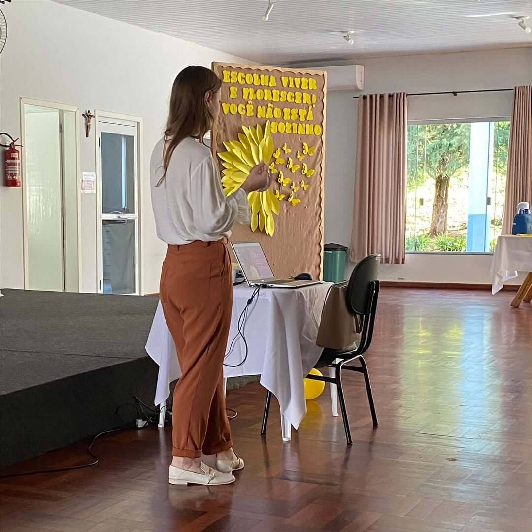 Durante uma palestra realizada para o SOS Prudentópolis, a psicóloga da clínica Jaíne Okonoski promoveu uma reflexão sobre saúde mental e prevenção ao suicídio, dentro da campanha Setembro Amarelo. A atividade reuniu colaboradores e buscou conscientizar sobre a relevância de falar abertamente sobre o tema.
