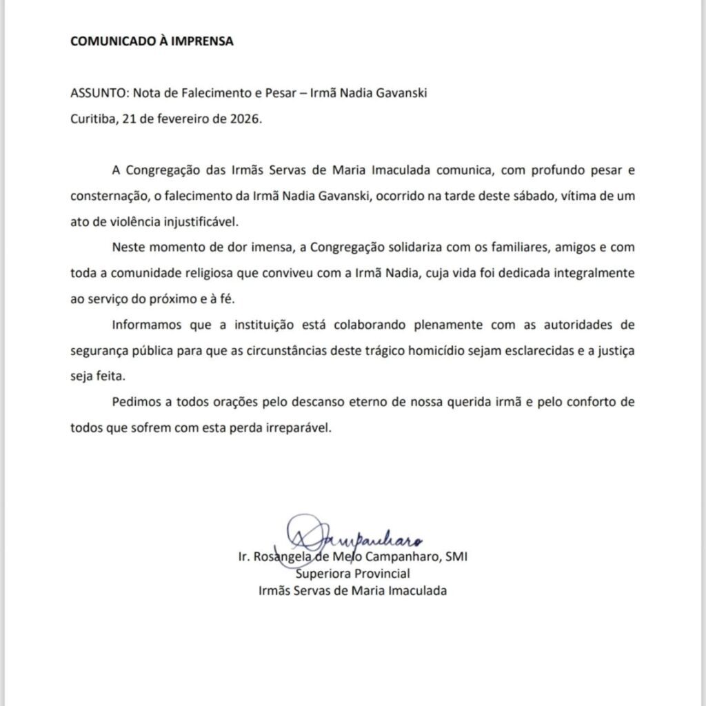 Uma freira de 85 anos foi assassinada na tarde deste sábado (21), no município de Ivaí, nos Campos Gerais do Paraná. A principal linha de investigação aponta para um possível latrocínio, roubo seguido de morte.