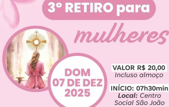 A Paróquia São João Batista promove no dia 7 de dezembro o 3º Retiro para Mulheres, um momento dedicado à oração, silêncio interior e transformação espiritual. Com o tema “Curadas para amar”, o encontro começará às 7h30 no Centro Social São João Batista e tem o valor de R$ 20, já com almoço incluído.