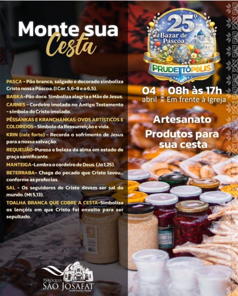 Tradição religiosa e valorização da cultura local marcam o Sábado de Aleluia em Prudentópolis, com a realização da bênção dos alimentos na Matriz São Josafat e a 25ª edição do Bazar de Páscoa, reunindo fiéis e visitantes ao longo de todo o dia, das 8h às 17h.