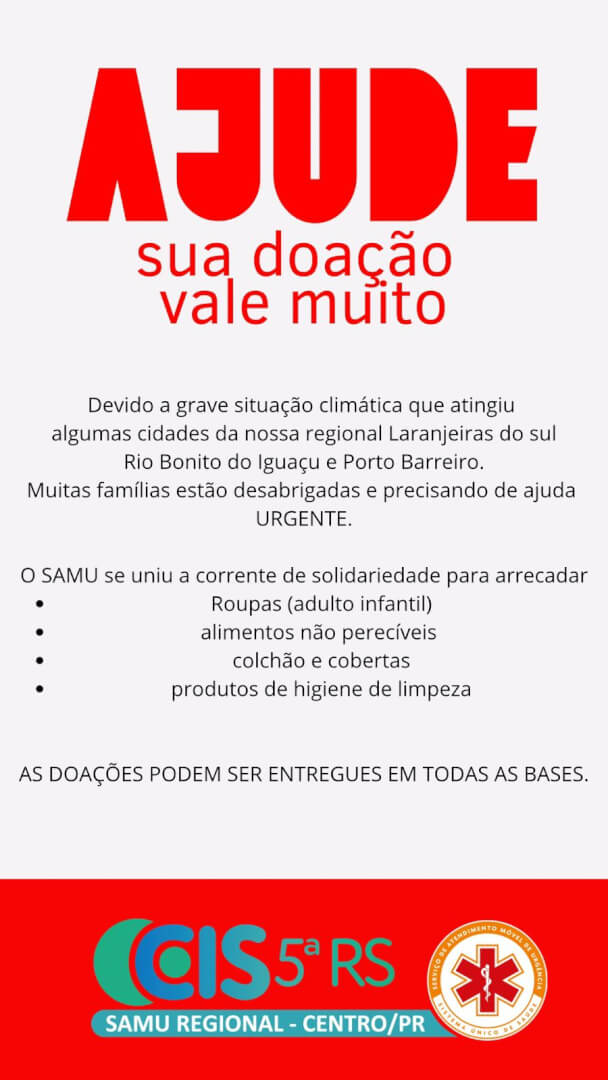 Diante da grave situação climática que atingiu municípios da regional com destaque para Laranjeiras do Sul, Rio Bonito do Iguaçu e Porto Barreiro o SAMU Regional Centro/PR iniciou uma campanha emergencial de arrecadação para apoiar famílias desabrigadas e em situação de vulnerabilidade.