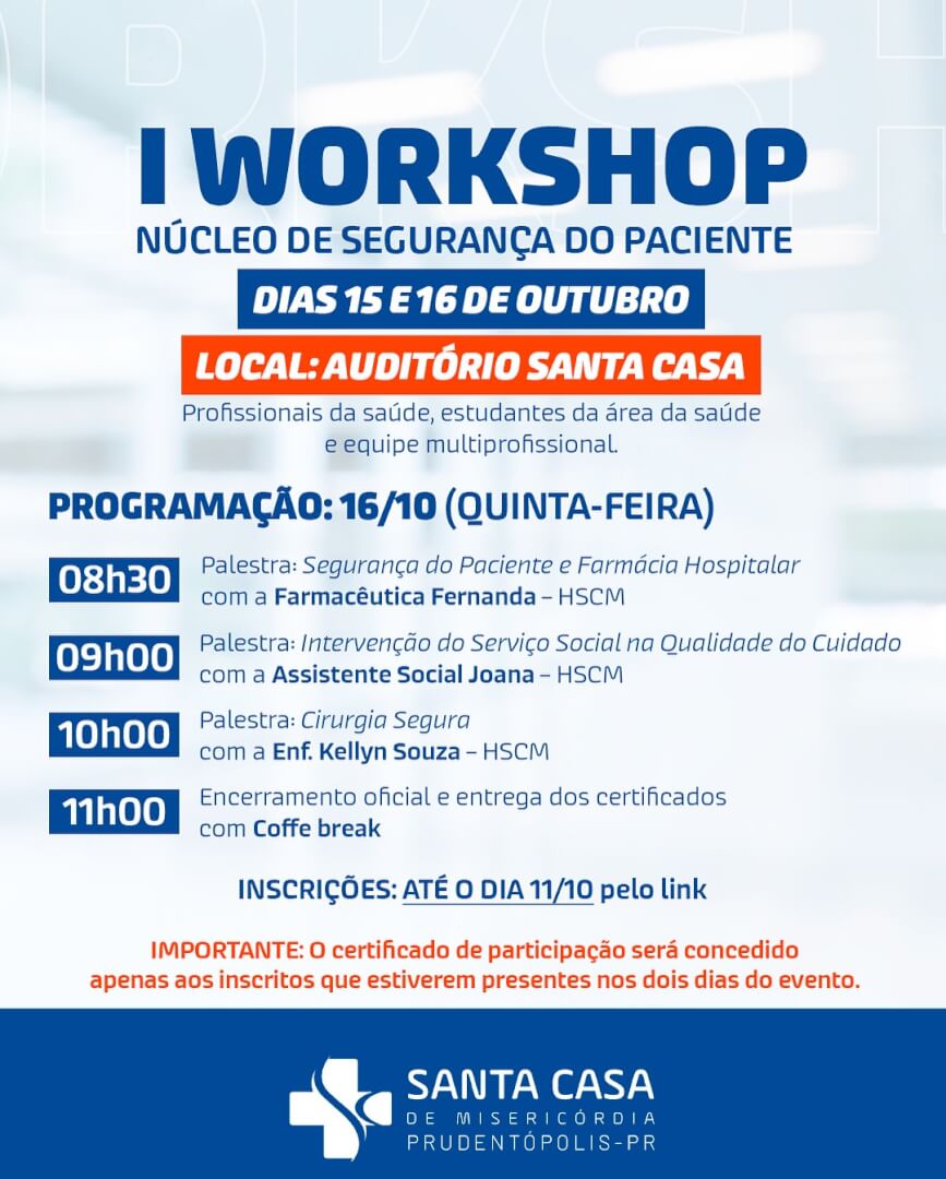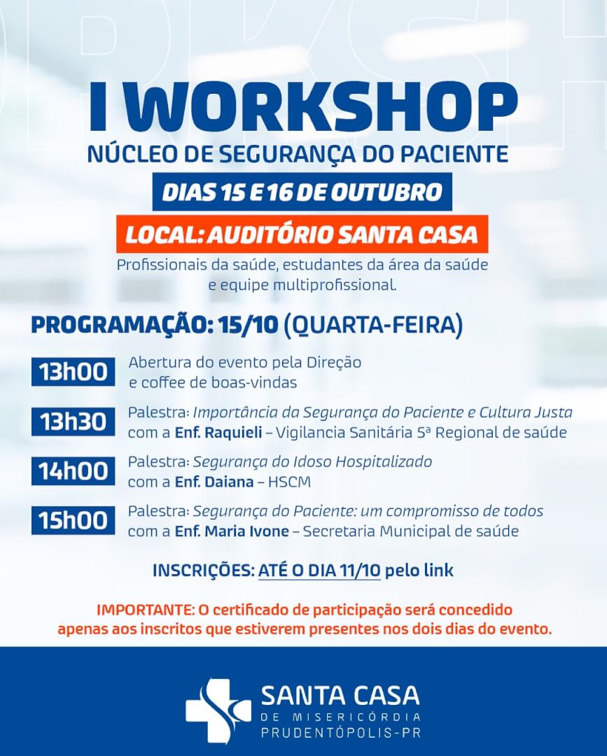 A Santa Casa de Misericórdia de Prudentópolis promove, nos dias 15 e 16 de outubro, o I Workshop do Núcleo de Segurança do Paciente, aberto a profissionais da saúde, estudantes e equipes multiprofissionais, no auditório da instituição.