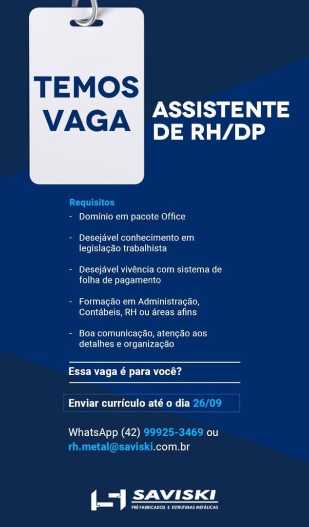 A Saviski está recebendo currículos para a função de Assistente de RH/DP. A oportunidade é imediata e o prazo de envio termina nesta sexta-feira (26/09). As candidaturas podem ser encaminhadas pelo WhatsApp (42) 99925-3469 ou pelo e-mail rh.metal@saviski.com.br.