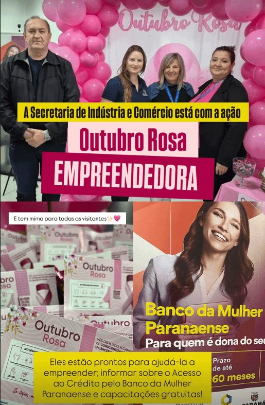 A Secretaria de Indústria e Comércio de Prudentópolis aderiu à campanha “Outubro Rosa Empreendedora”, unindo a conscientização sobre a saúde da mulher à valorização do empreendedorismo feminino. A ação busca incentivar mulheres a investir em seus negócios, oferecendo informações sobre crédito facilitado pelo Banco da Mulher Paranaense e sobre capacitações gratuitas para quem deseja empreender ou expandir sua atuação no mercado.