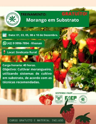 O Sindicato Rural de Prudentópolis está abrindo vagas para um treinamento gratuito sobre “Morango em Substrato”, voltado a produtores e interessados em iniciar ou aprimorar a produção de morango com base em técnicas recomendadas de cultivo. A formação tem carga horária total de 40 horas e será realizada nos dias 1º, 3, 5, 8 e 10 de dezembro, na sede do Sindicato Rural.