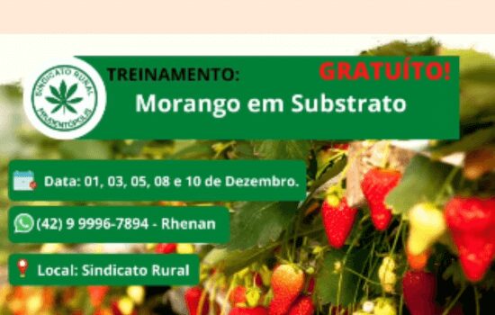 O Sindicato Rural de Prudentópolis está abrindo vagas para um treinamento gratuito sobre “Morango em Substrato”, voltado a produtores e interessados em iniciar ou aprimorar a produção de morango com base em técnicas recomendadas de cultivo. A formação tem carga horária total de 40 horas e será realizada nos dias 1º, 3, 5, 8 e 10 de dezembro, na sede do Sindicato Rural.