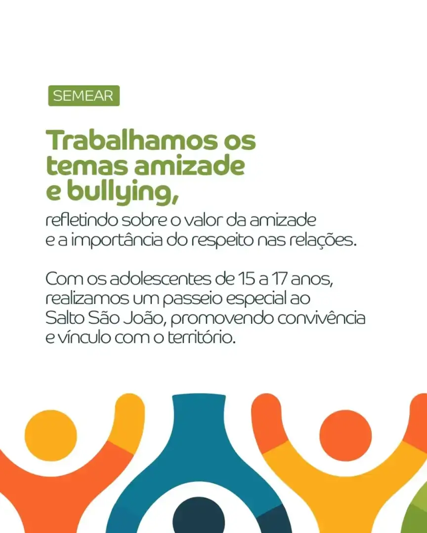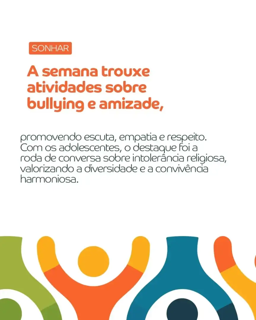 Entre os temas trabalhados estiveram amizade, bullying e convivência harmoniosa, com reflexões sobre o valor do respeito nas relações e rodas de conversa sobre intolerância religiosa, destacando a importância da diversidade e da escuta.
