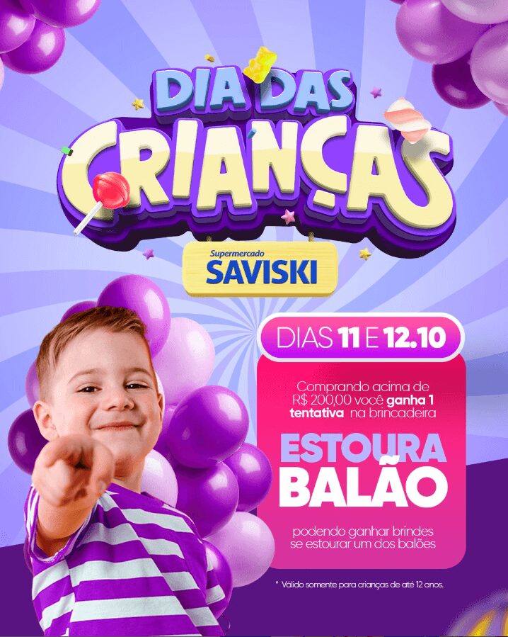 O Supermercado Saviski anunciou uma programação especial para comemorar o Dia das Crianças. Nos dias 11 e 12 de outubro, cada R$ 200 em compras dará direito a uma tentativa na brincadeira “Estoura Balão”, onde os pequenos poderão encontrar brindes escondidos.