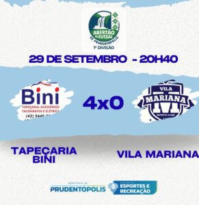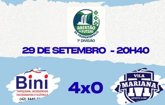 A segunda-feira (29) foi de grandes jogos pelo Abertão de Futsal de Prudentópolis 2025, no Ginásio de Esportes Gilmar Agibert. Na primeira partida da noite, a Tapeçaria Bini mostrou força e garantiu vitória expressiva ao bater o Vila Mariana por 4 a 0, em confronto válido pela 1ª Divisão.