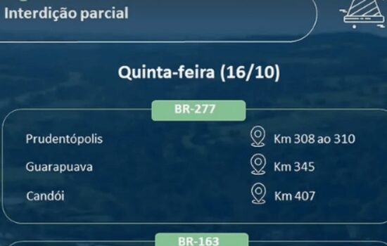 A concessionária EPR Iguaçu informou que a BR-277, no trecho que passa por Prudentópolis, terá interdição parcial nesta quinta-feira (16), entre os quilômetros 308 e 310, devido à execução de obras de conservação na rodovia. A medida faz parte da agenda semanal de obras da empresa, que também atua em trechos das BR-163 e PR-280.