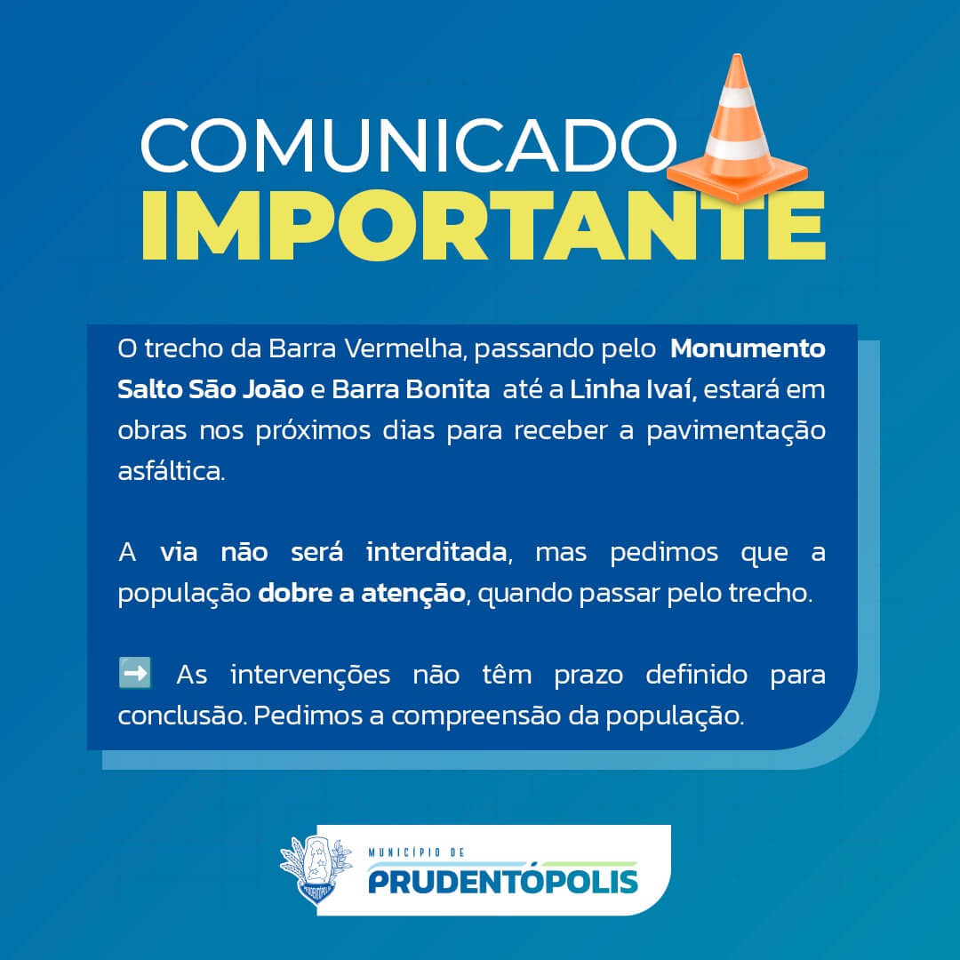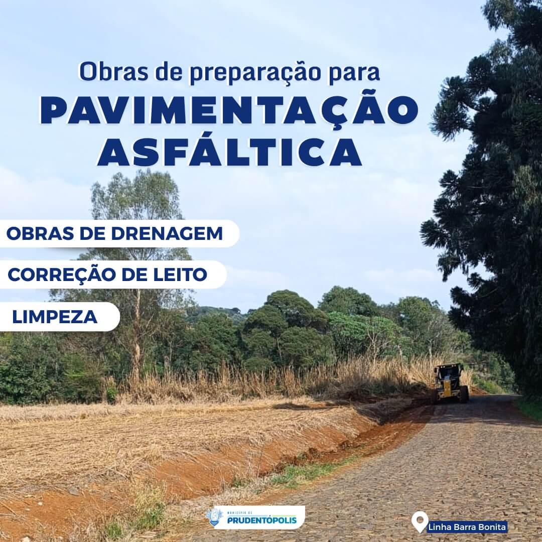 A Prefeitura de Prudentópolis iniciou as obras de preparação para a pavimentação asfáltica no trecho que liga Barra Vermelha ao Monumento Salto São João, passa por Barra Bonita e segue até a Linha Ivaí. O tráfego permanece aberto, sem interdição, porém motoristas e moradores devem transitar com cautela. Não há prazo definido para a conclusão.