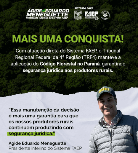 Para o setor produtivo local, o entendimento traz estabilidade para quem precisa regularizar passivos, ampliar sistemas produtivos ou acessar linhas de financiamento que exigem conformidade ambiental. Segundo o presidente interino do Sistema FAEP, Ágide Eduardo Meneguette, “essa manutenção da decisão é mais uma garantia para que os nossos produtores rurais continuem produzindo com segurança jurídica”.