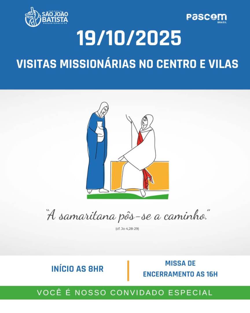 A Paróquia São João Batista promove no dia 19 de outubro as Visitas Missionárias pelo centro e pelas vilas de Prudentópolis. As equipes saem às 8h para os encontros nas casas e o encerramento está previsto para as 16h, com Santa Missa. Toda a comunidade é convidada a se integrar à programação.